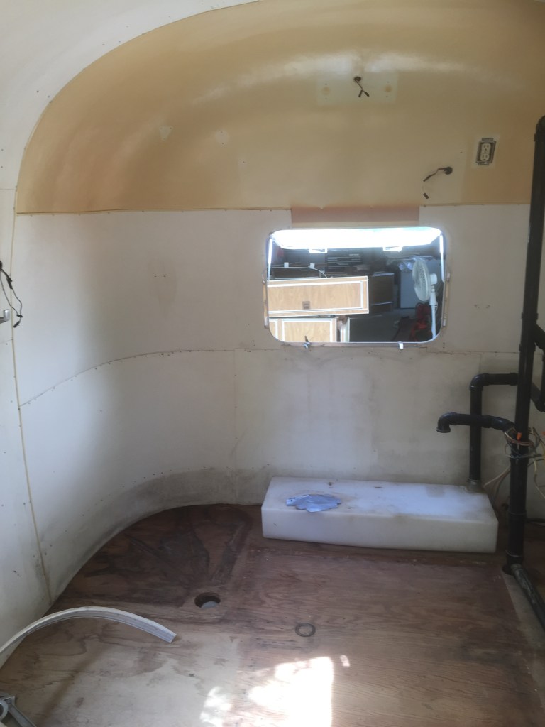We brought the Argosy to our friends house to work on it while we handle some work. It is awesome to have some help. Everything is going quickly. We removed the original interior a few days ago and were able to use their garage to pile and clean the original interior parts. Shanna rolled out Kilz oil based primer while I was chopping out the floor. The wood sub floor slides under the walls into a 2 inch channel and is structural to supporting the walls. We used a large wedge under the plywood and then some ratchet straps to bend the board. It needs to fit under the walls and is bigger than the interior space.