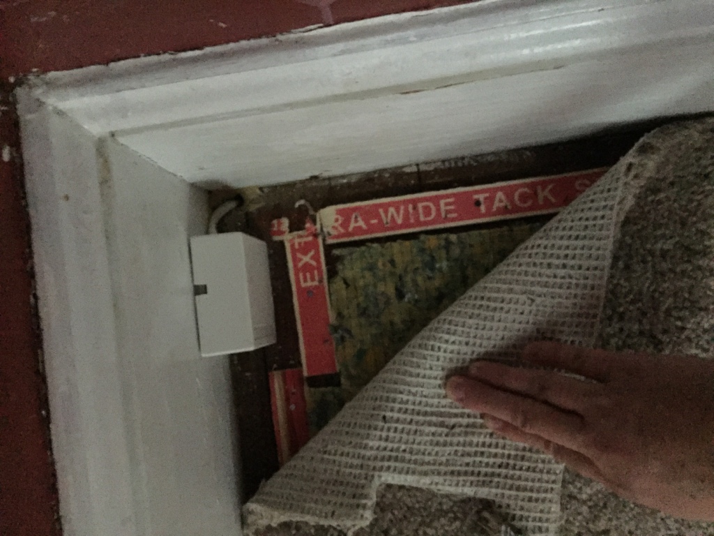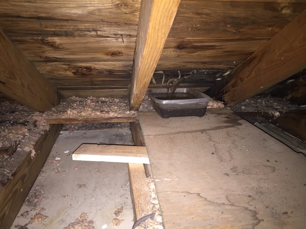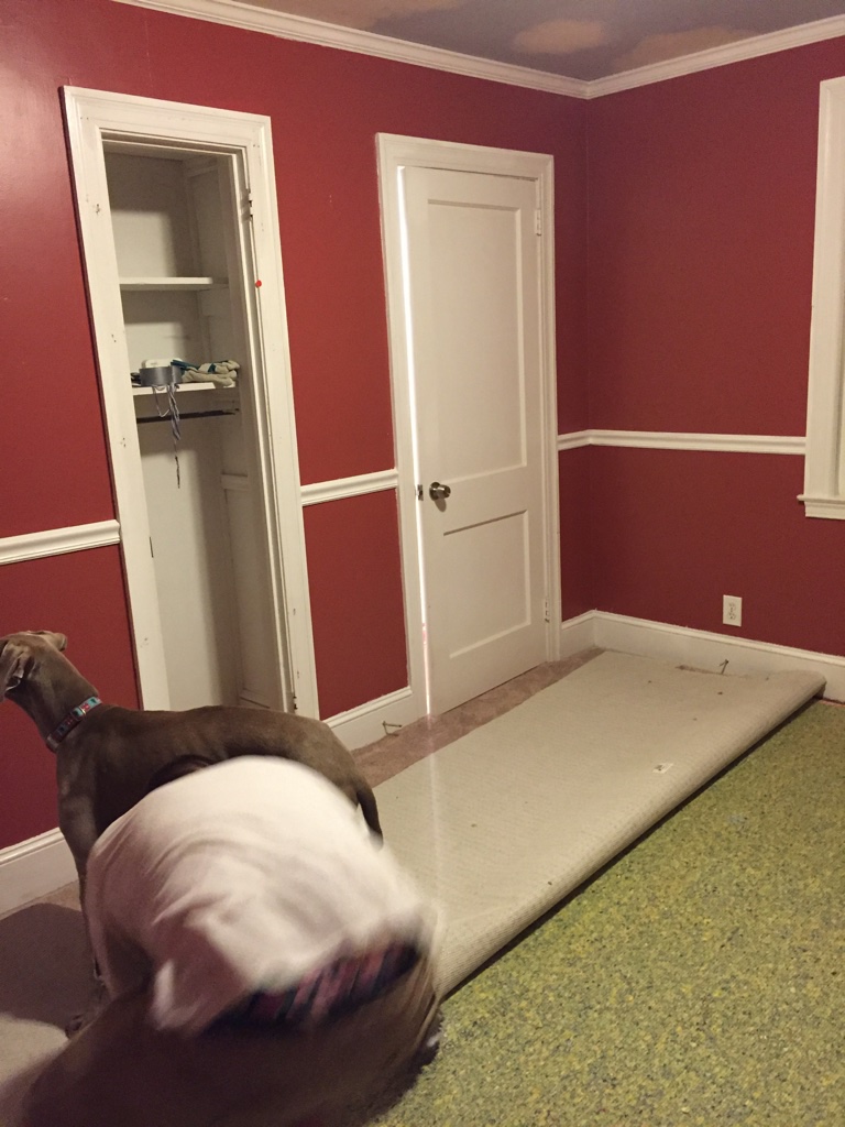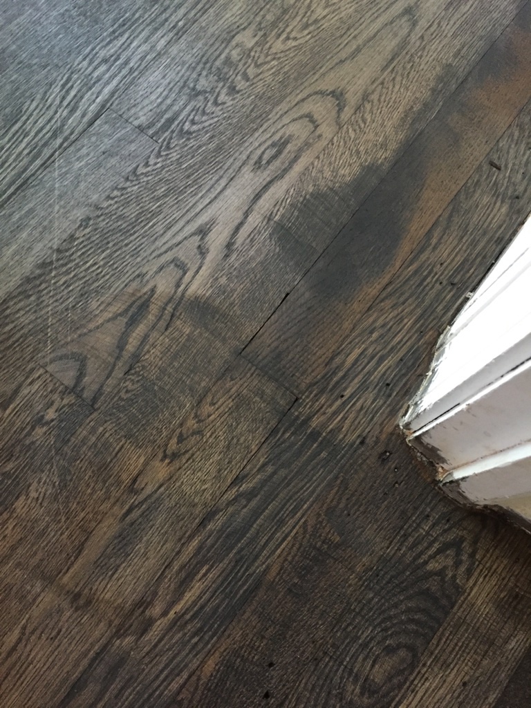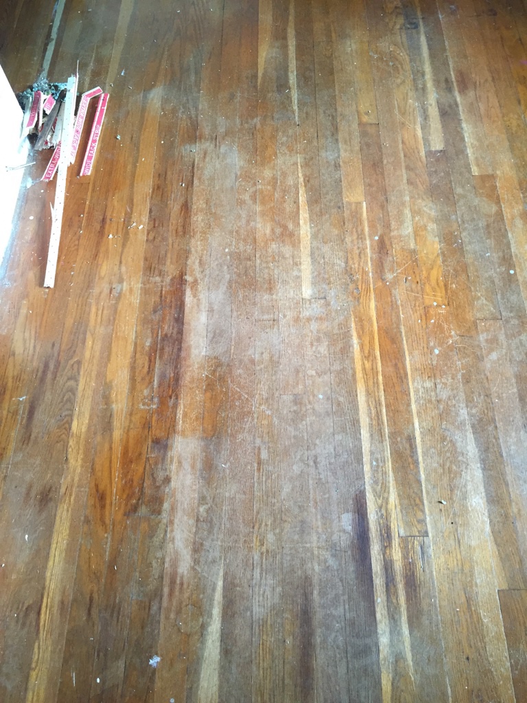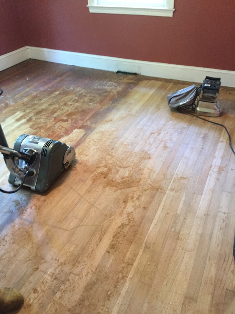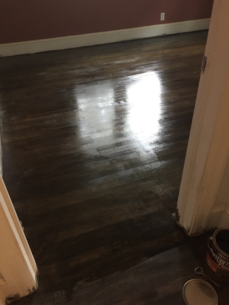 This is one of several pans of overflowing rain water in the eaves of the house attic. It has been a wet season so it has been overflowing for some time. Andrew climbed onto the ladder and scraped and cleaned the silicone off of the roof to see what was really going on. It is annoying that people were claiming that they didn’t know about the leak but clearly were trying to make it stop. We can fix a lot ourselves if we know what to expect. Lying to us has caused stuff to be damaged needlessly.My brother and I are both allergic to cats. This carpet reeks of cat urine and needs to be ripped out before we even get out the air mattresses for our first night.The corner peel shows hardwood floors in both bedrooms! Woo!ummm….. I am not sure what is going on here. The hole in the floor to the subfloor or crawl space under the house? Either way it was hidden by the gross carpet.Peeling back the carpet with Lola helping.The stinky cat urine stained carpet removed. I can see why the previous owners put down carpet. Some stains, damage and the old flooring nails show in a few spots but we are going to sand it down ourselves since it is damaged already.Andrew figures that we don’t have any real furniture yet so we may as well sand all the floors and stain them all one color through the entire house. He isn’t wrong but none of us have used floor sanders before and I am a little worried.It is far from perfect but it is than it was with the carpet. We mixed a can of espresso minwax with dark walnut and rubbed the stain on with a rag. You can see where we took down too much along the edge of the room but only if you look close. It doesn’t bother me,I don’t love gloss floors so I slapped a single coat of satin polyurethane on the floor and called it good. Andrew and Lola are hard on floors and I don’t want to be too fussy. I am not looking for perfection. The living room floor all done