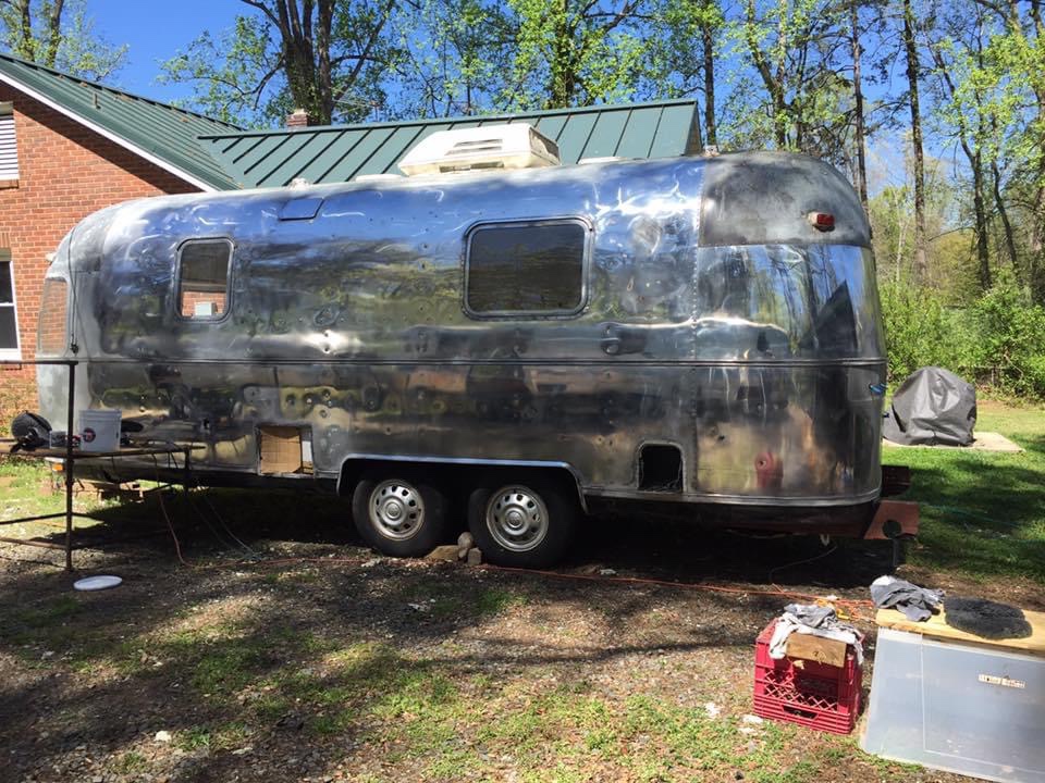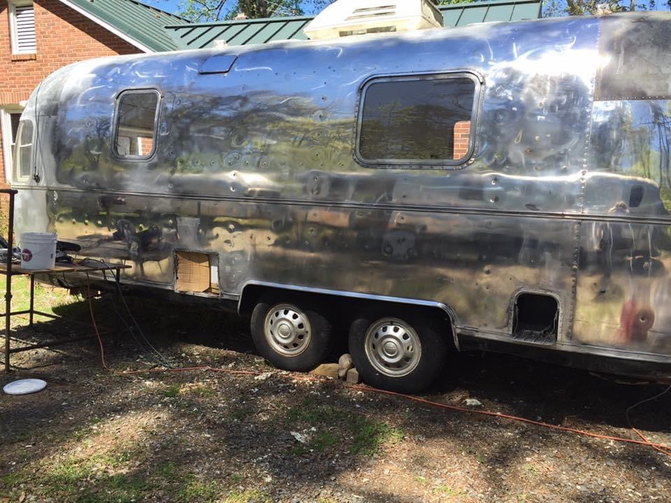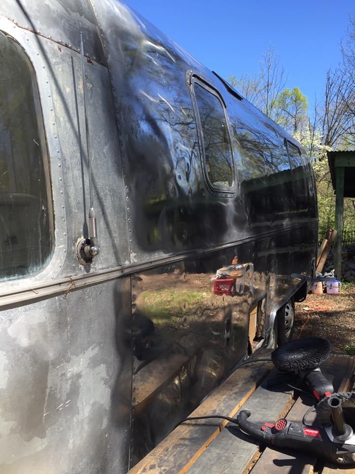 The spring weather is great. I have begun to polish this Argosy using wool pads, a cheap buffer from Harbor Freight and Nuvite compounds. Many people leave the polishing to the end of their project. Polishing is often just considered a cosmetic task. When I intend to polish a trailer, I like to get the first cut and by far the worst of this filthy labor intensive task completed. Then I can seal the coach before I really get too far along in a build. Polishing is dirty and tiring workThe first cut leaves swirls and marks but really shows the potential.Buffing compound tracks everywhere and leave gray black smudges, foot prints and sears on everything. I like to get the buffing done and then move the trailer to a new spot and keep working on the interior. I make less of a mess that way.