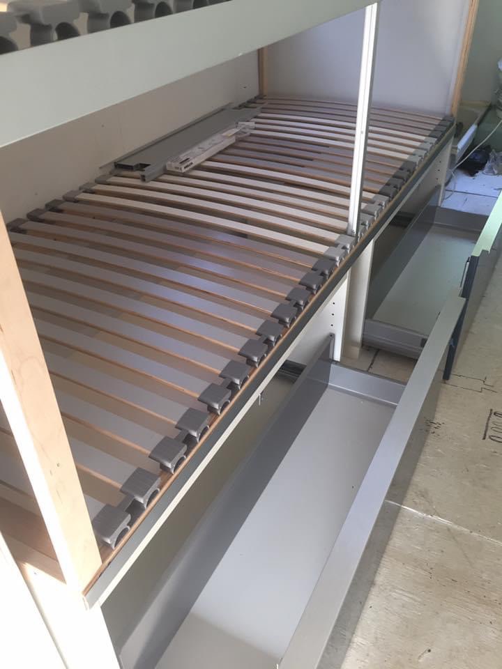 The holiday season is upon us and we have not been very committed to getting the work done. I only had about 2 hours to tinker and added some bunk bed supports and drawer handles. It was satisfying to even get these little tasks completed. Happy holidays to everyone!