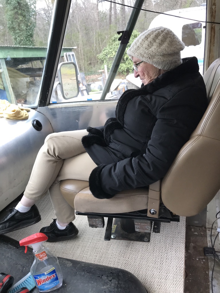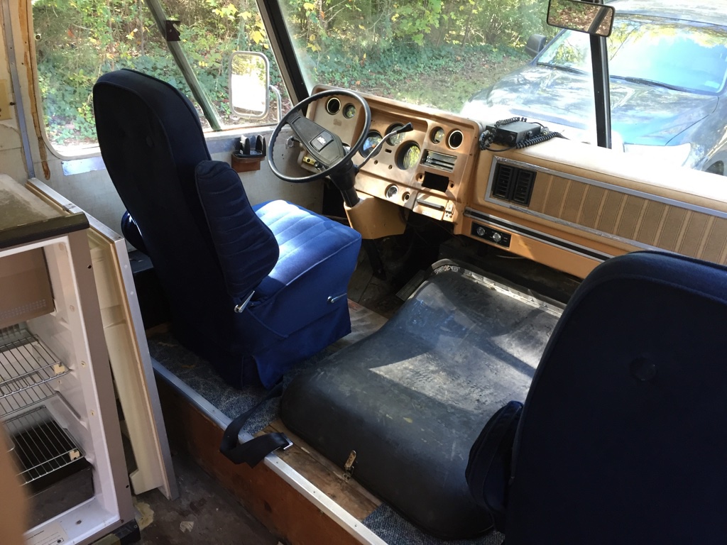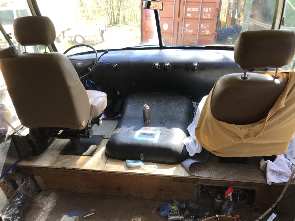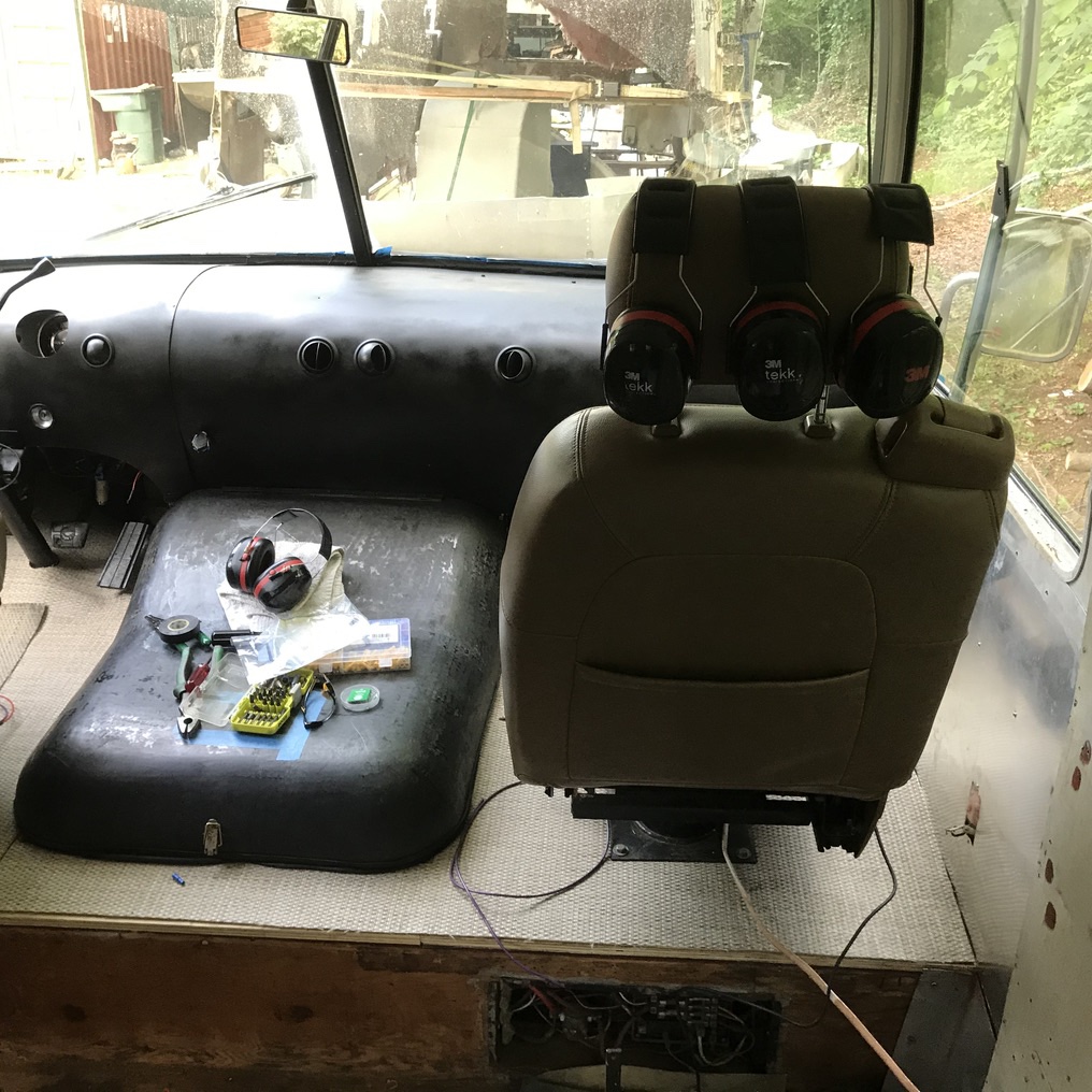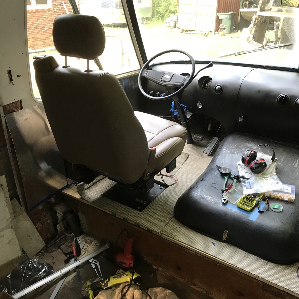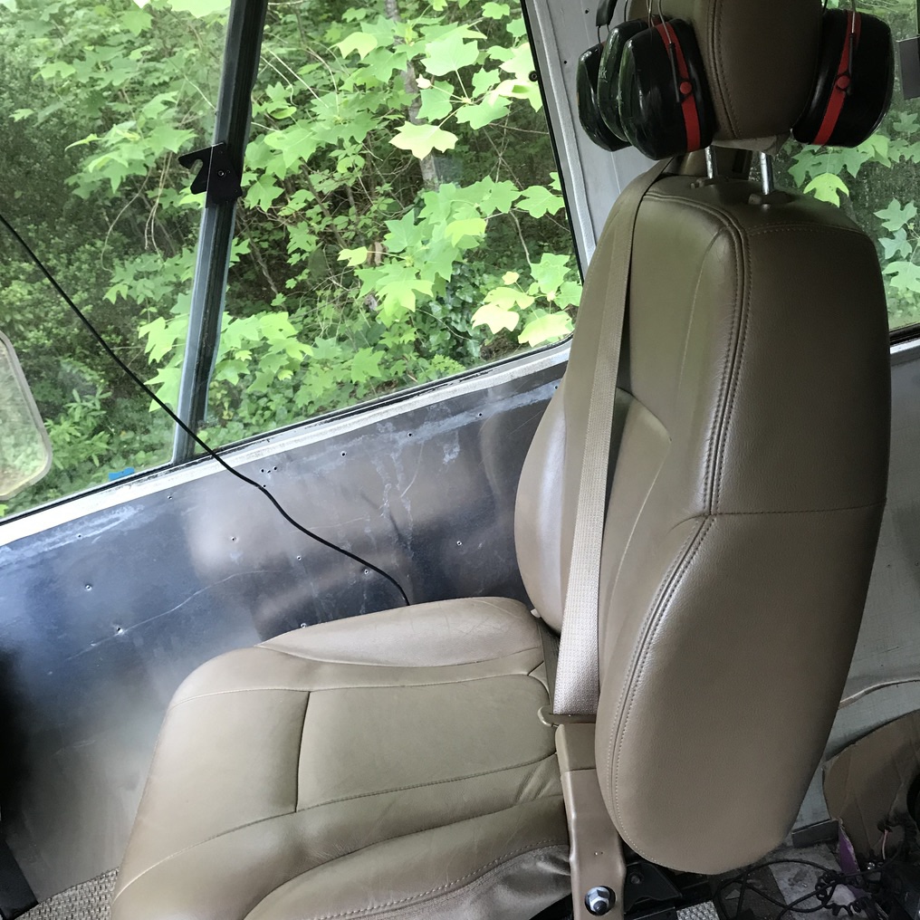 The motorhome seats were a smelly blue crumbling foam mess. They had the old lap belts with no shoulder straps. Andrew started scouring Craigslist for seats removed from a car with built in shoulder seat belts. We found a set of leather seats with built in shoulder straps that had been removed from a Trailblazer. We modified the seat base a little to bolt it to the rv swivel seat base. The driver side seat is powered and I am excited to see if we can make that work. It is right next to the battery box and I am hopeful that eventually it will fully function.