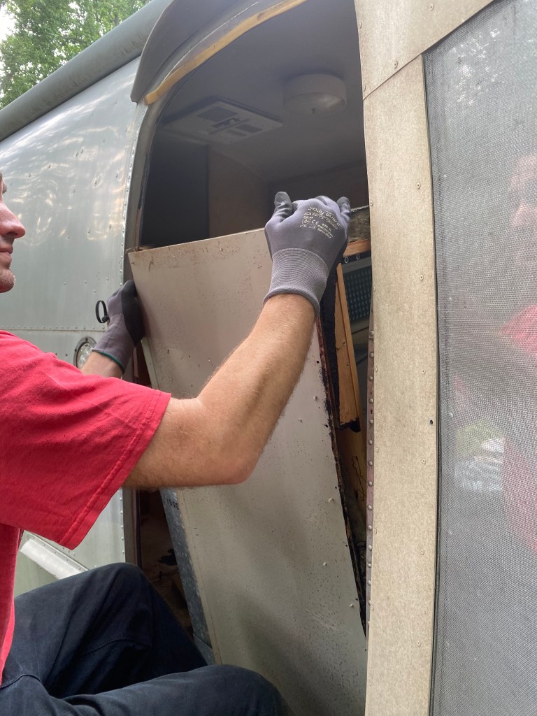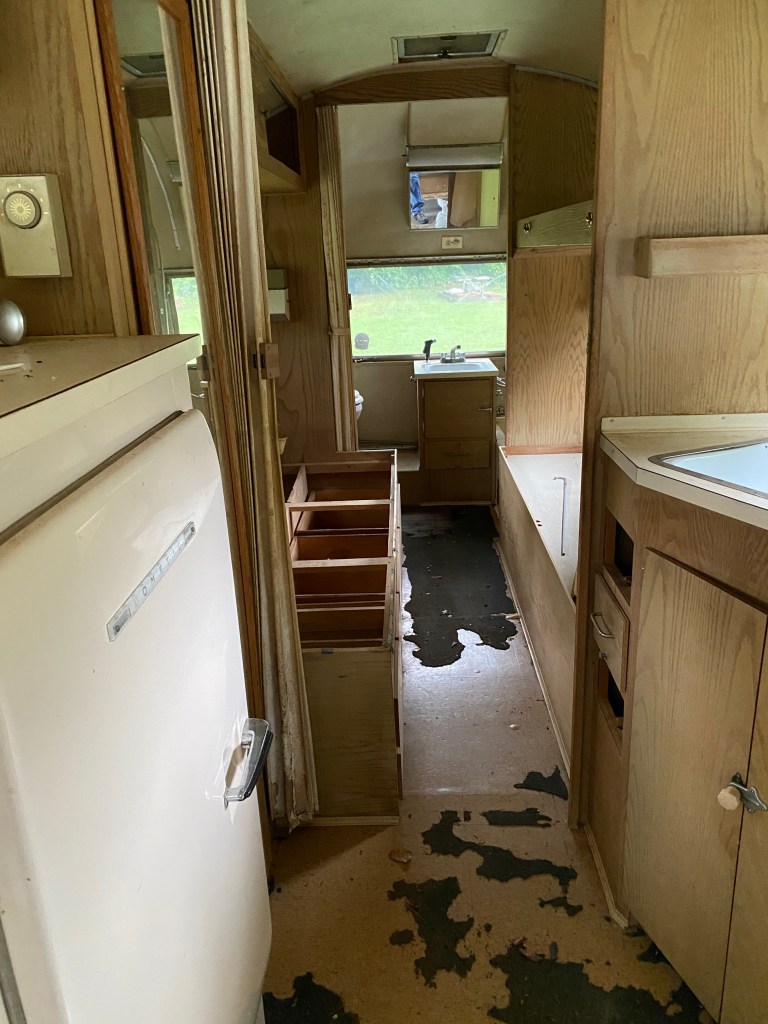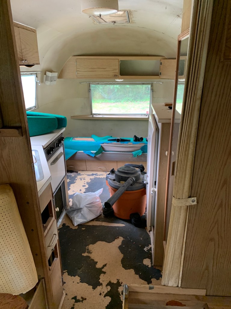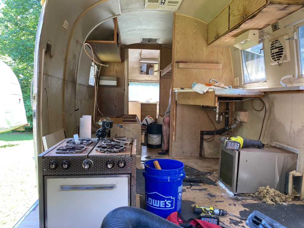 This is the interior of one of the pair of 1960’s Project Airstreams that we pulled from a field in New England. Andrew went inside with trash bags. He collected trash and mouse nests that were tucked everywhere. One thing lead to another and the simple project snowballed. We dug deeper into the cabinets and behind appliances. More mouse nests have continued to materialize and we are realizing that the interior skins are going to need to come down.