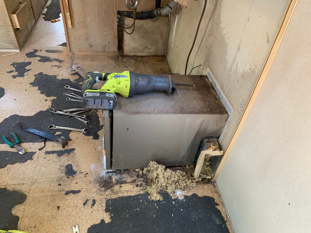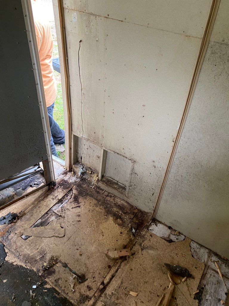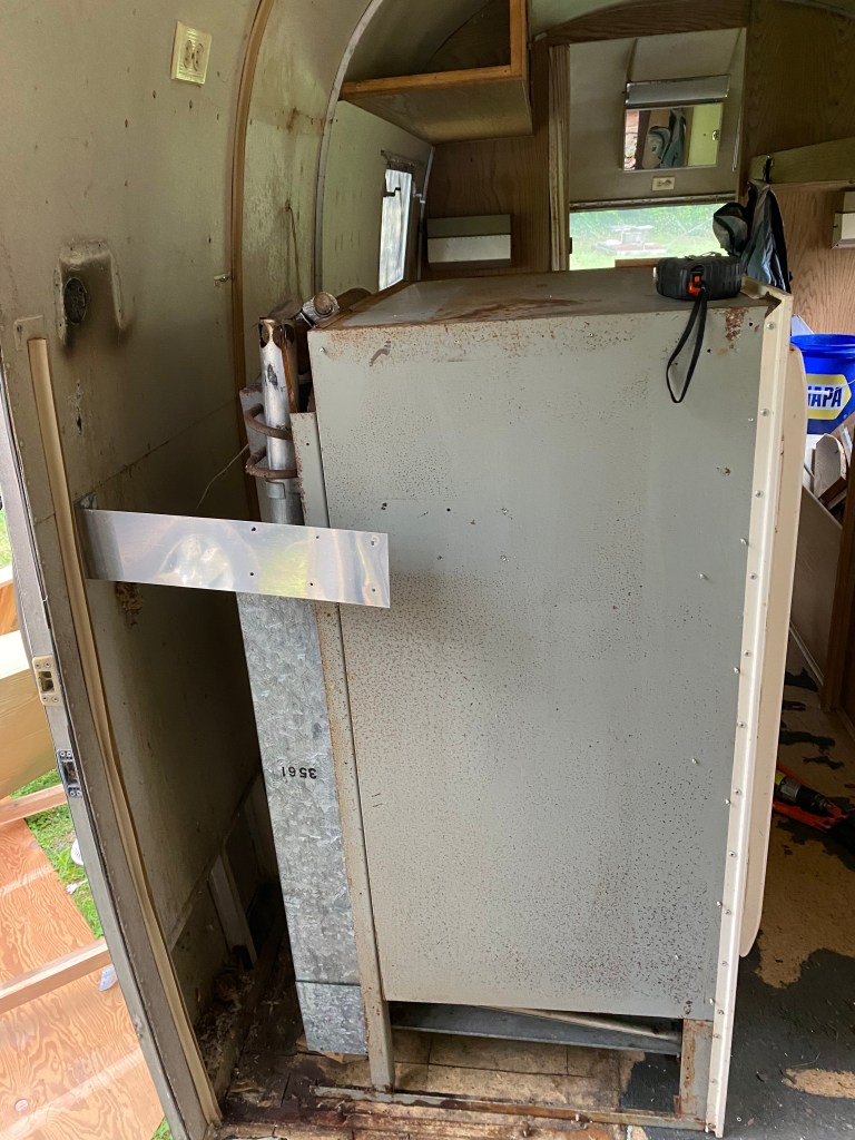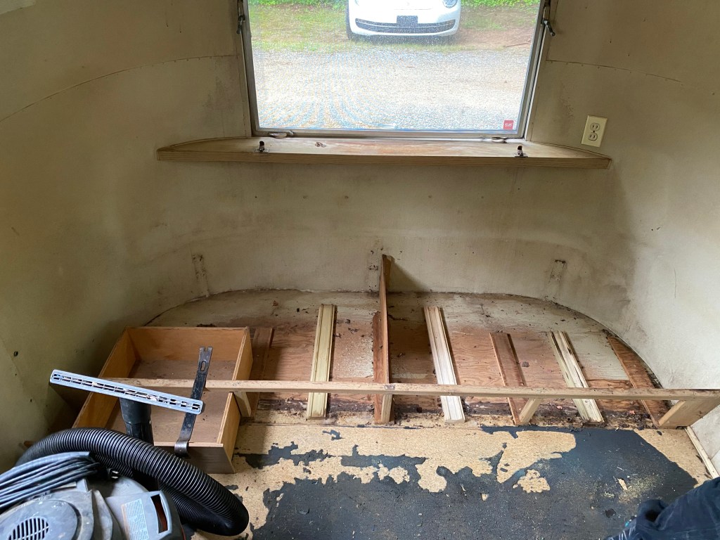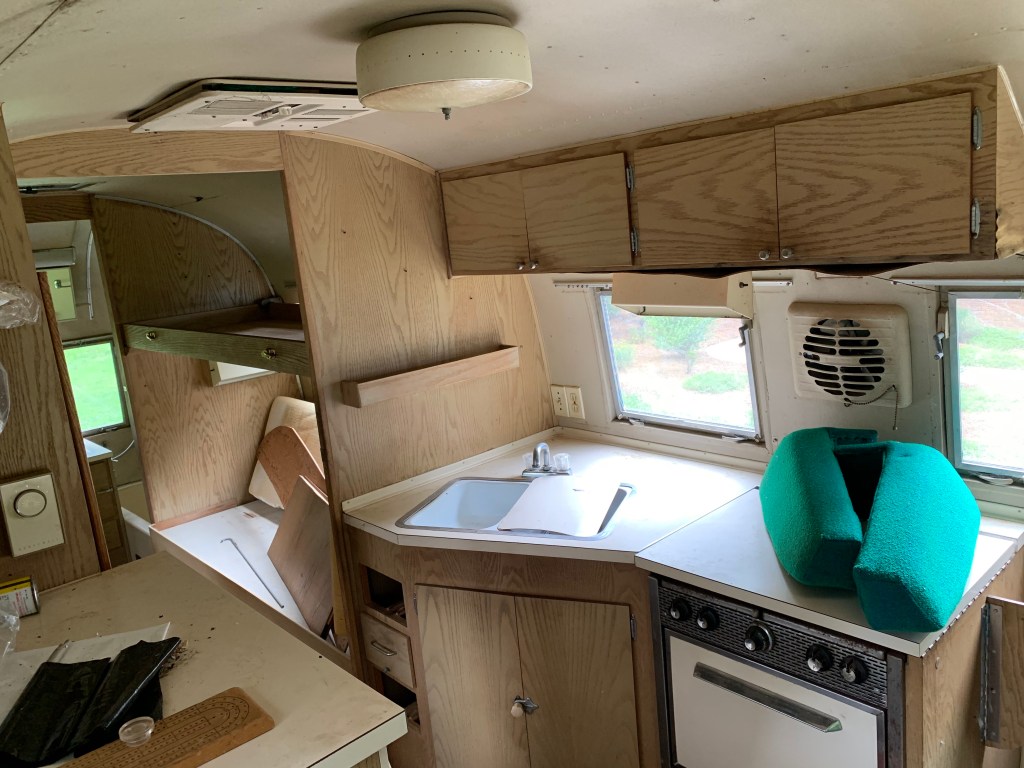 This is the interior of one of the pair of 1960’s Project Airstreams that we pulled from a field in New England. Andrew went inside with trash bags. He collected trash and mouse nests that were tucked everywhere. One thing lead to another and the simple project snowballed. We dug deeper into the cabinets and behind appliances. More mouse nests have continued to materialize and we are realizing that the interior skins are going to need to come down.