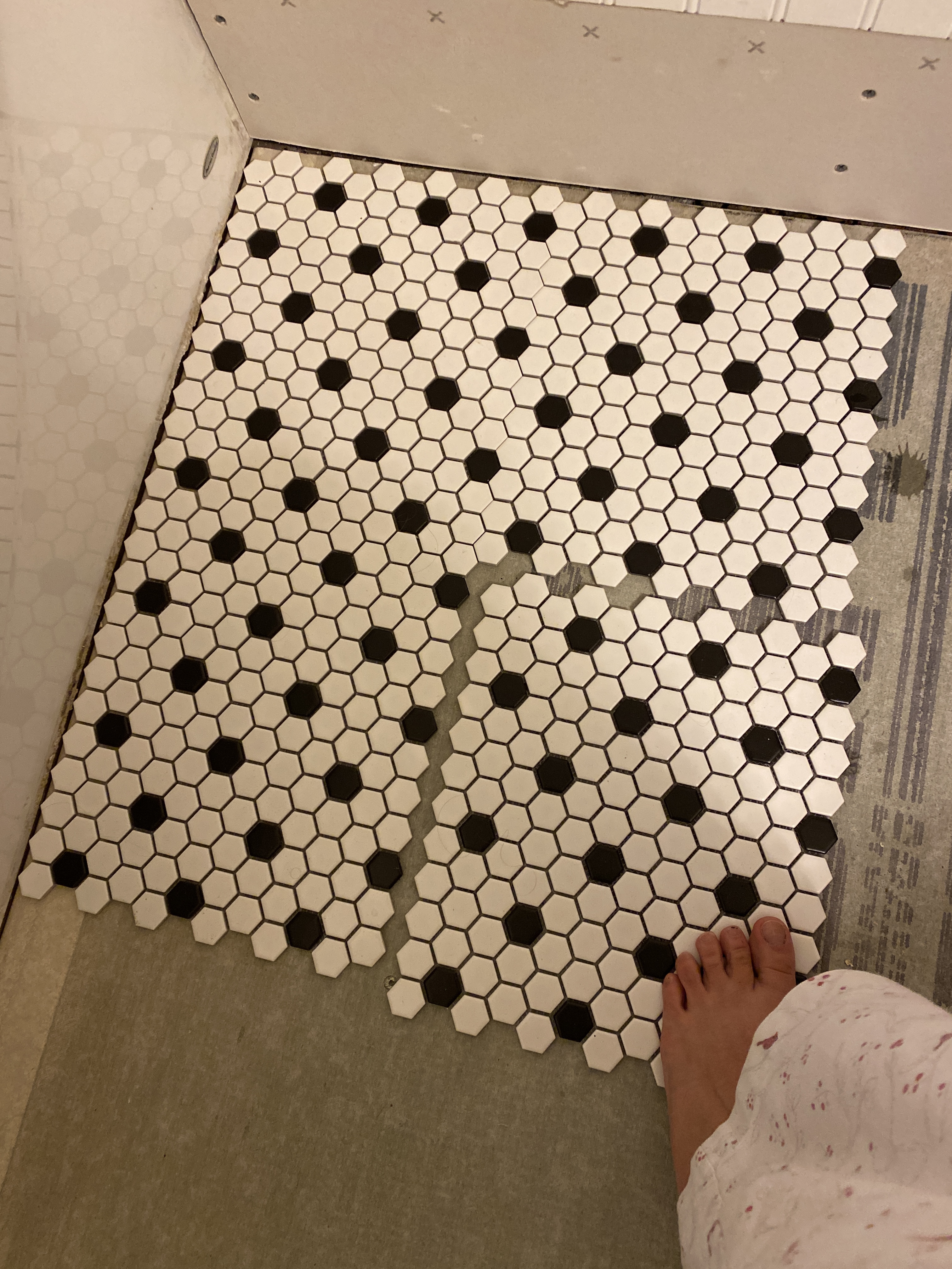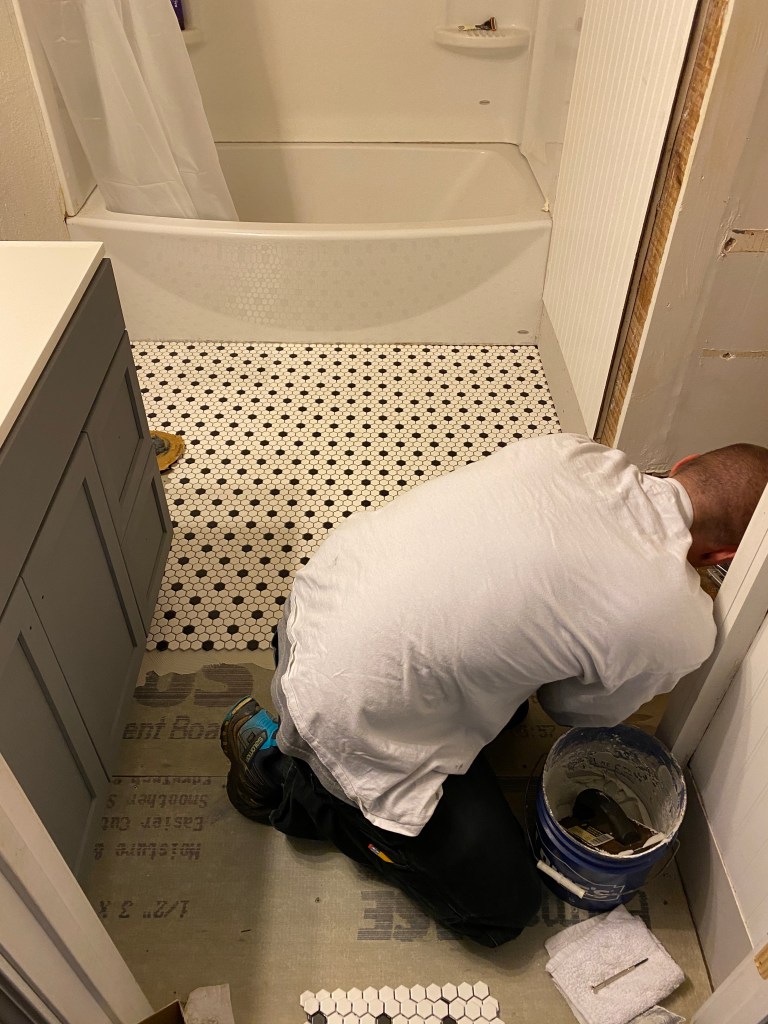 I went with an affordable sheet tile that was on clearance. It had a nice hexagon pattern that wasn’t too modern for my older home. Did I mention it was on clearance?
