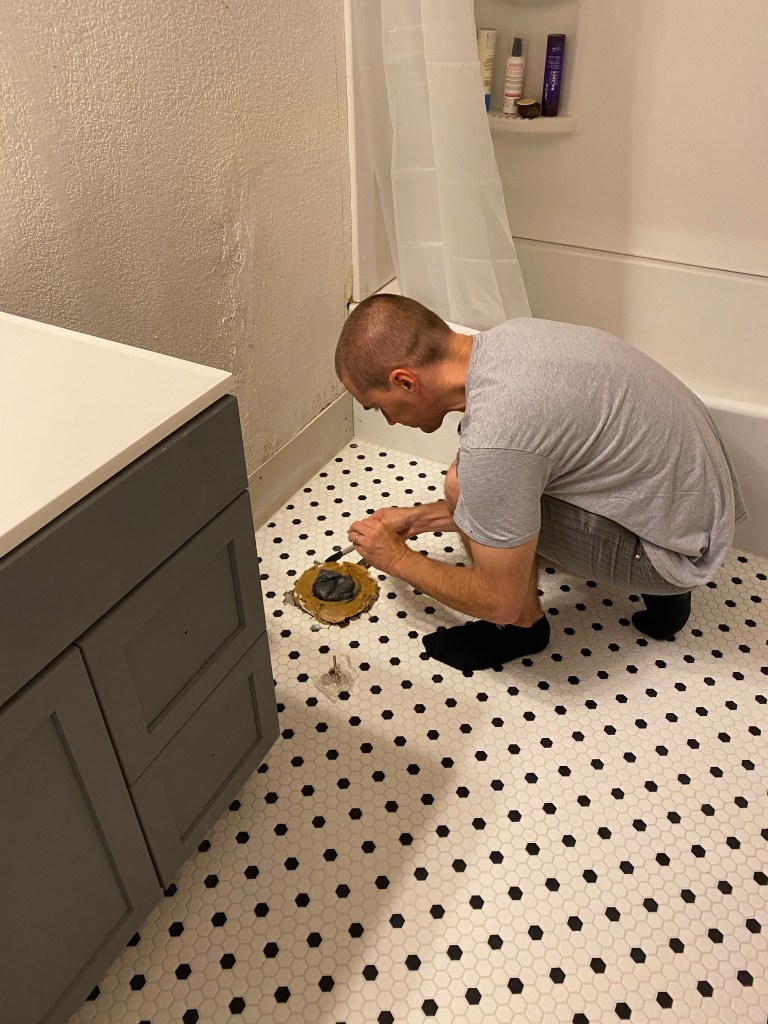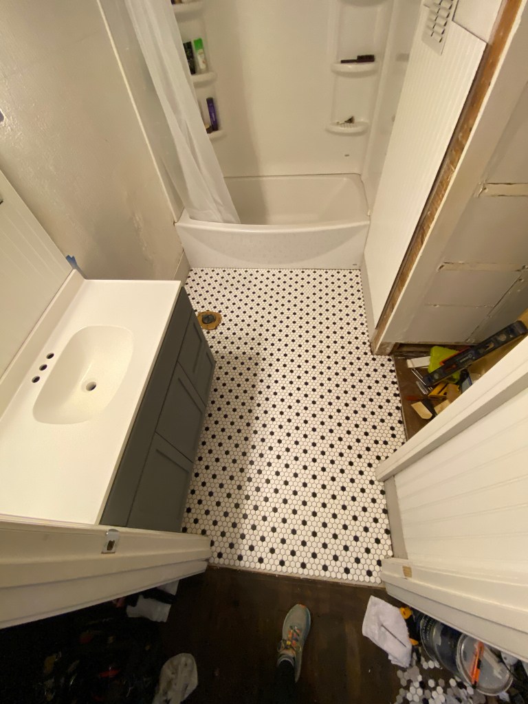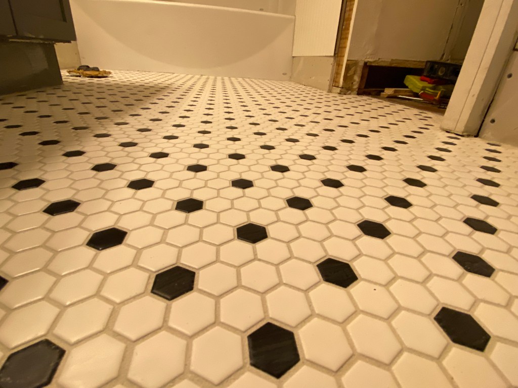 Today my teacup humans came to help me grout the tile. It was a tight squeeze but a pretty great activity. My niece and nephew both wanted to be part of the bathroom project. They were both particularly motivated as there are no Auntie overnights until the bathroom is back to 100% functionality.