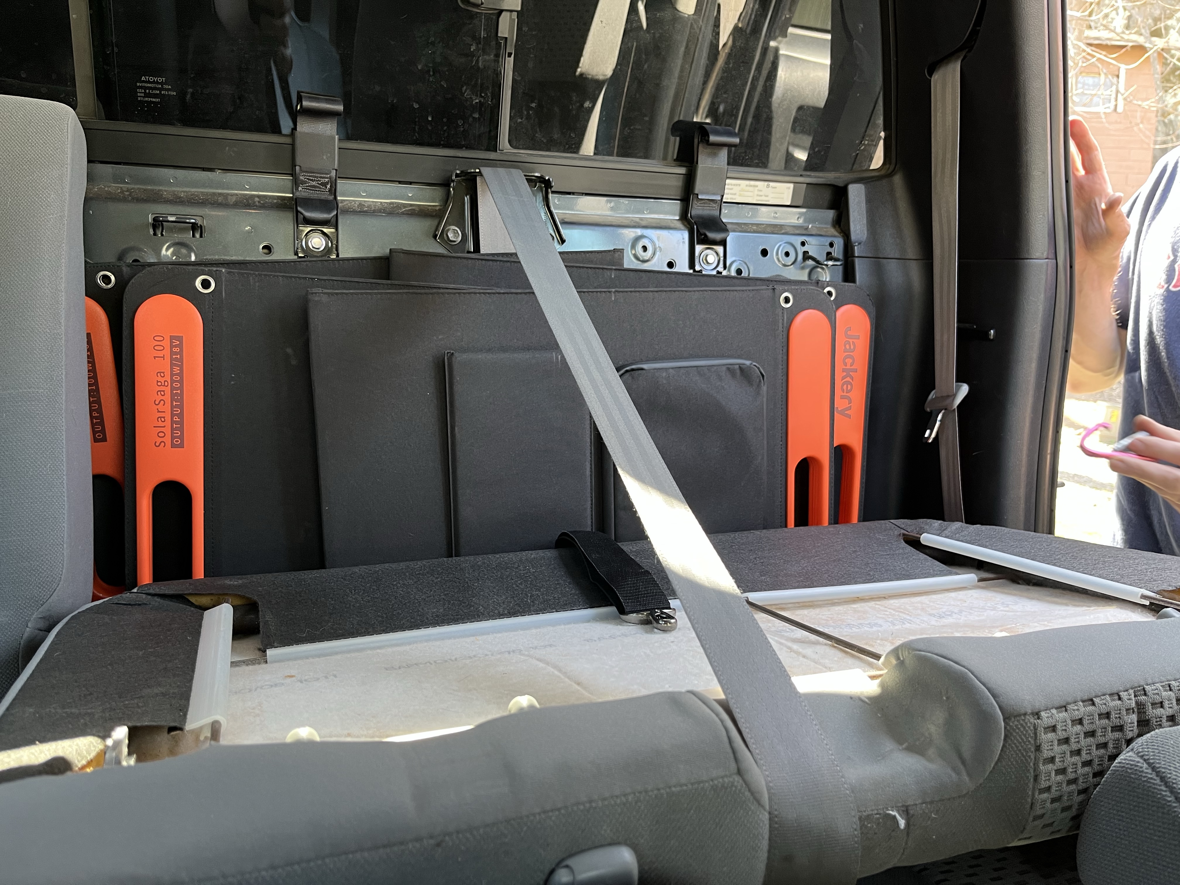 Andrew and I need a dedicated storage location for the Solar Saga panels that came with the Jackery Explorer 1500 Solar Generator. After some trail and error and debating, we decided to modify the back seat of the Tundra for storage in the truck.